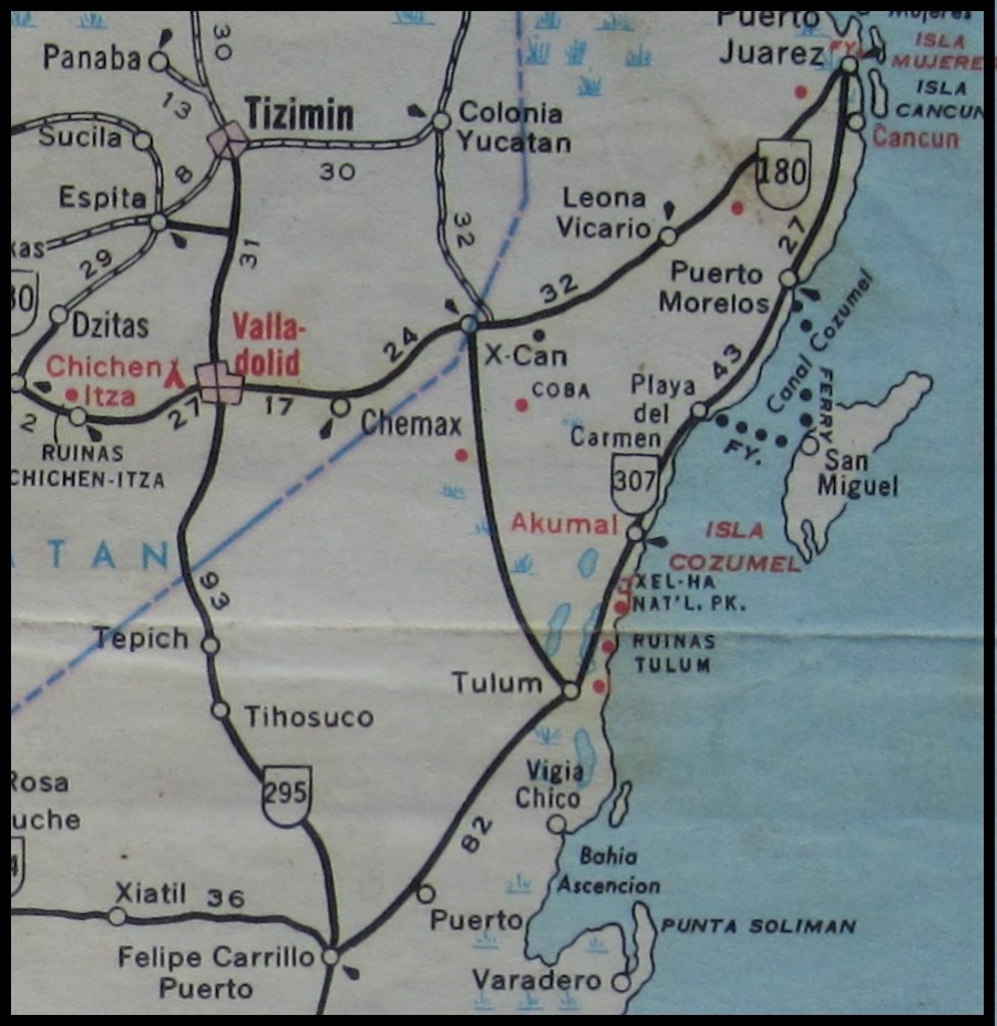 The main road continued 82 kms south-west to the village of Felipe Carrillo Puerto. A rough dirt road ran from the temple, just behind the dunes and palm trees, south along the Boca Paila Peninsula to Punta Allen, 65 kms away. To the north it was 70 kms of undeveloped palm-fringed beaches and coves to Isla Mujeres. Cancun was still in the planning stage. And a paved road ran north-west towards the Mayan Ceremonial Centre of Coba and on to, according to my map, X-Can and Chichen Itza.