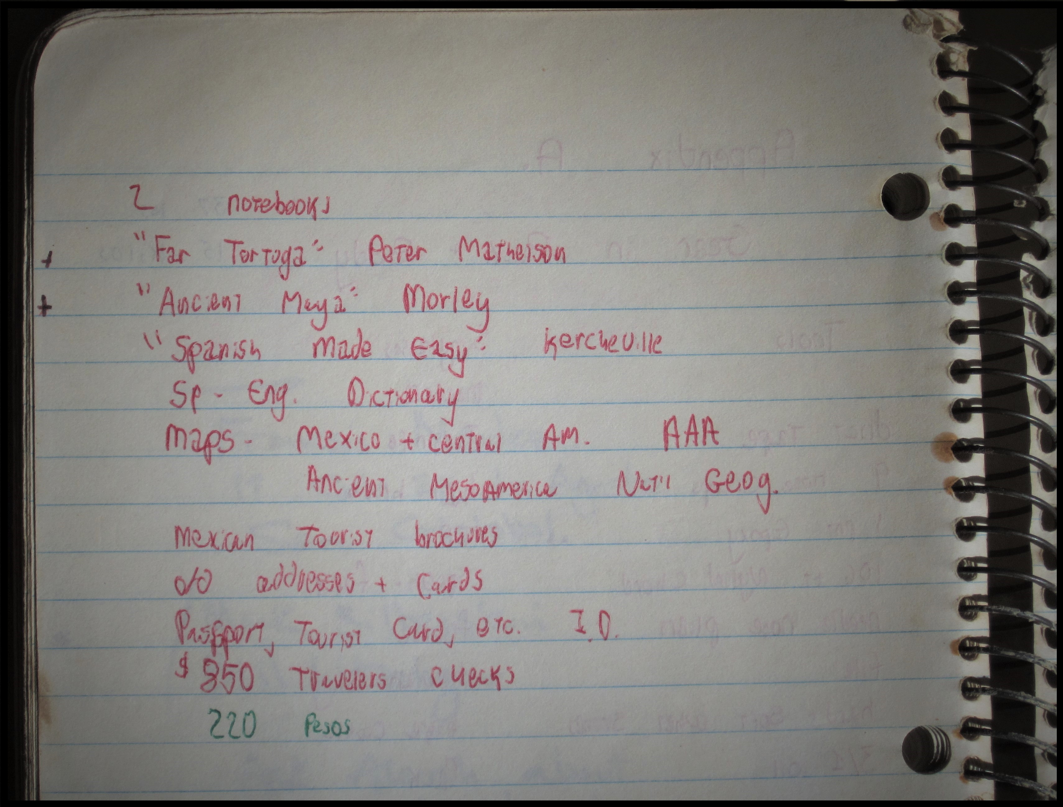 In addition to the two blank notebooks, I carried a large-scale 1975 AAA ‘Map of Mexico and Central America‘, the National Geographic ‘Map of Mesoamerica‘ and some brochures with tourist-type maps. Brought along my hardcover edition of Morley’s ‘Ancient Maya’ and Peter Matheison’s ‘Far Tortuga’ in paperback. Plus a ‘Spanish Made Easy’ text book and a Spanish-English dictionary. I’d study Morley more closely when I was there.