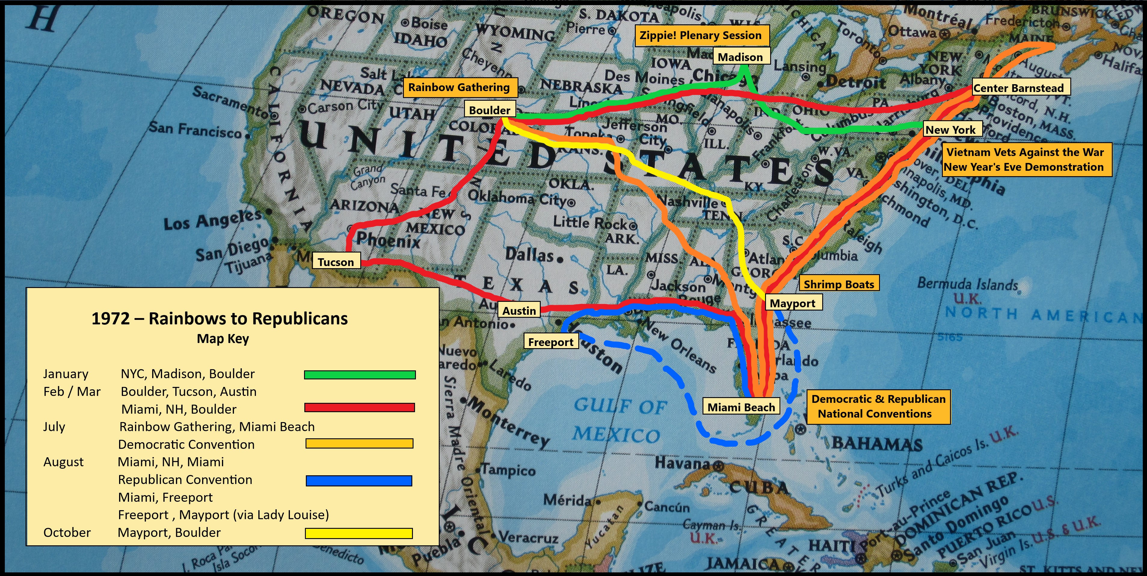 The anti-war circuit was at it’s apogee. The tide had turned against the war on Viet-Nam. Demos around the country drew thousands of protesters every week. Big party scene. The marquee events for 1972 would be the planned demonstrations at the Democratic and Republican National Conventions in Miami Beach over the summer.